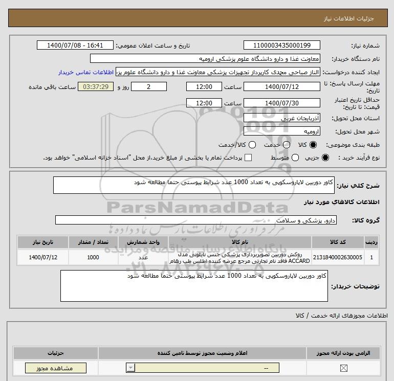 شرح کلی نیاز: کاور دوربین لاپاروسکوپی به تعداد 1000 عدد شرایط پیوستی حتما مطالعه شود