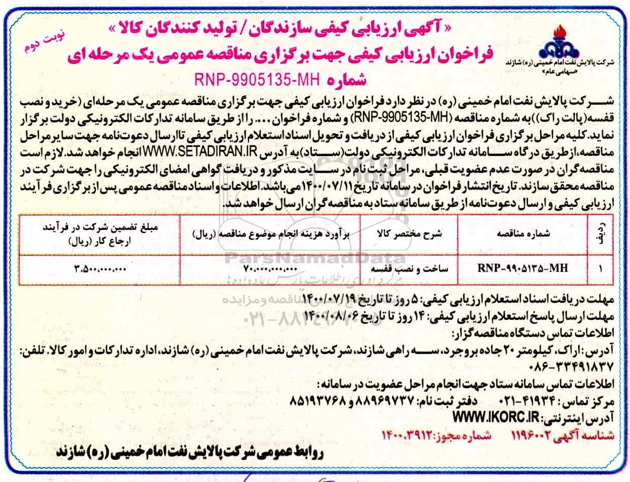 شرکت پالایش نفت امام خمینی (ره) در نظر دارد فراخوان ارزیابی کیفی جهت برگزاری مناقصه عمومی یک مرحله ای (خرید و نصب قفسه (پالت راک) به شماره مناقصه (RNP-9905135-MH) و شماره فراخوان ... را از طریق سامانه تدارکات الکترونیکی دولت برگزار نماید کلیه مراحل برگزاری فراخوان ارزیابی کیفی از دریافت و تحویل اسناد استعلام ارزیابی کیفی تا ارسال دعوت نامه جهت سایر مراحل مناقصه از طریق درگاه سامانه تدارکات الکترونیکی دولت ستاد به آدرس ستاد ایران انجام خواهد شد لازم است مناقصه گران در صورت عدم عضویت قبلی مراحل ثبت نام در سایت مذکور و دریافت گواهی امضای الکترونیکی ار جهت شرکت در مناقصه محقق سازند تاریخ انتشار فراخوان در سامانه تاریخ 1400.7.11 می باشد اطلاعات و اسناد مناقصه عمومی پس از برگزاری فرایند ارزیابی کیفی و ارسال دعوتنامه از طریق سامانه ستاد به مناقصه گران ارسال خواهد شد .