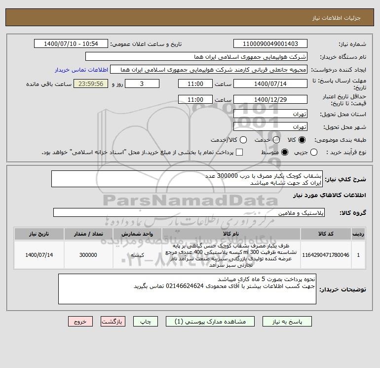 نام دستگاه خریدار:شرکت هواپیمایی جمهوری اسلامی ایران هما