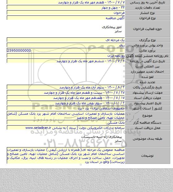 عملیات بازسازی و تعمیرات اساسی ساختمان امام شهر یزد بانک مسکن (شامل عملیات تهیه، تامین مصالح و تجهیز