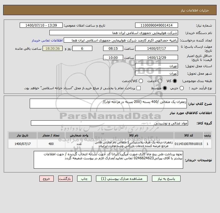 شرح کلی نیاز: زعفران یک مثقالی /400 بسته (200 بسته در مرحله اول)/