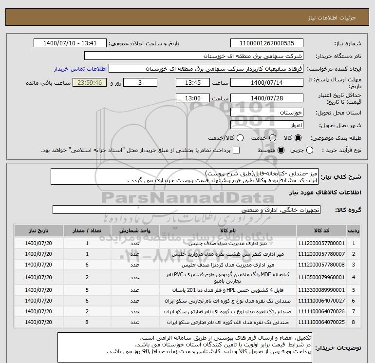 استعلام میز -صندلی -کتابخانه-فایل(طبق شرح پیوست) ایران کد مشابه بوده وکالا طبق فرم پیشنهاد قیمت پیوست خریداری می گردد ., استعلام میز -صندلی -کتابخانه-فایل(طبق شرح پیوست) ایران کد مشابه بوده وکالا طبق فرم پیشنهاد قیمت پیوست خریداری می گردد .