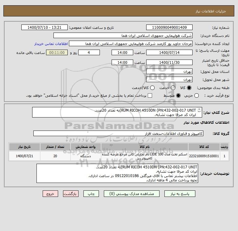 شرح کلی نیاز: RUM RICOH 4510DN (PN:432-002-017 UNIT)به تعداد 20عدد. ایران کد صرفا جهت تشابه. اطلاعات بیشتر توضیحات مطالعه شود.