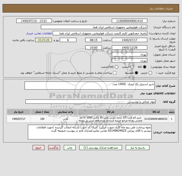 استعلام شیر استریل یک لیتری /1500 عدد , استعلام شیر استریل یک لیتری /1500 عدد