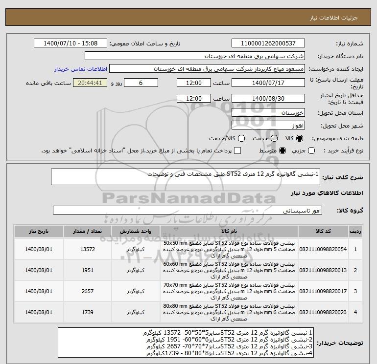 شرح کلی نیاز: 1-نبشی گالوانیزه گرم 12 متری ST52 طبق مشخصات فنی و توضیحات