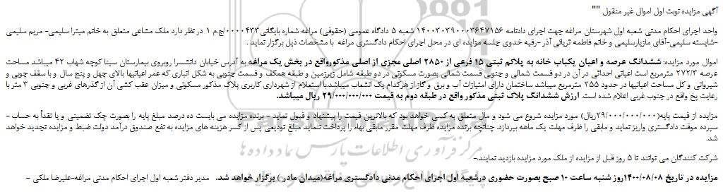 - مزایده در تاریخ 1400/08/08روز شنبه ساعت 10 صبح بصورت حضوری درشعبه اول اجرای احکام مدنی دادگستری مراغه(میدان مادر ) برگزار خواهد شد.   مدیر دفتر شعبه اول اجرای احکام مدنی مراغه-علیرضا ملکی
