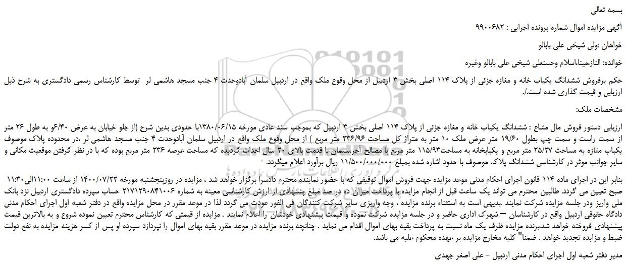 آگهی مزایده اموال شماره پرونده اجرایی : 9900682