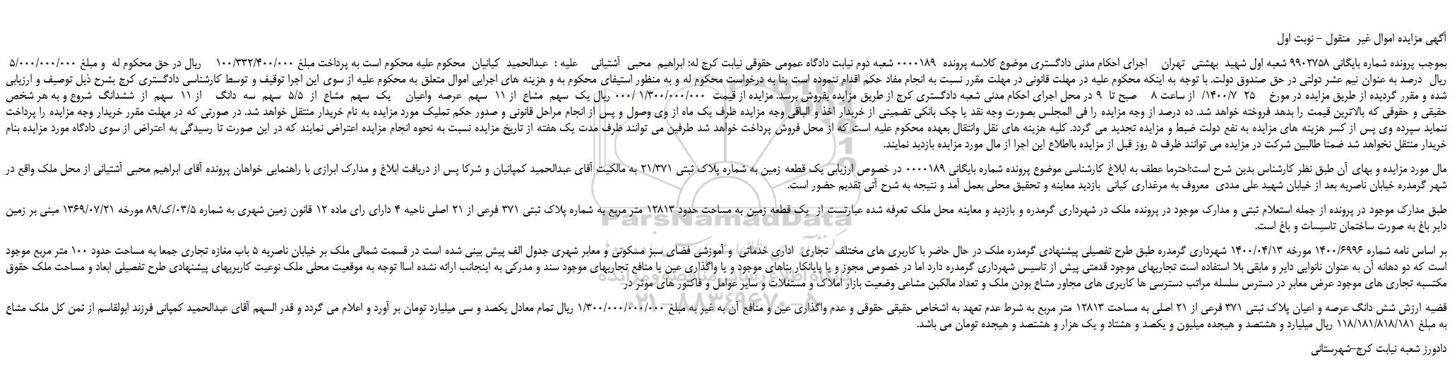 بموجب پرونده شماره بایگانی 9902758 شعبه اول شهید بهشتی تهران اجرای احکام مدنی دادگستری موضوع کلاسه پرونده 0000189 شعبه دوم نیابت دادگاه عمومی حقوقی نیابت کرج له: ابراهیم محبی آشتیانی علیه : عبدالحمید کیانیان محکوم علیه محکوم است به پرداخت مبلغ 100/332/400/000 ریال در حق محکوم له و مبلغ 5/000/000/000 ریال درصد به عنوان نیم عشر دولتی در حق صندوق دولت. با توجه به اینکه محکوم علیه در مهلت قانونی در مهلت مقرر نسبت به انجام مفاد حکم اقدام ننموده است بنا به درخواست محکوم له و به منظور استیفای محکوم به و هزینه های اجرایی اموال متعلق به محکوم علیه از سوی این اجرا توقیف و توسط کارشناسی دادگستری کرج بشرح ذیل توصیف و ارزیابی شده و مقرر گردیده از طریق مزایده در مورخ 25 1400/7/ از ساعت 8 صبح تا 9 در محل اجرای احکام مدنی شعبه دادگستری کرج از طریق مزایده بفروش برسد. مزایده از قیمت 1/300/000/000 /000 ریال یک سهم مشاع از 11 سهم عرصه واعیان یک سهم مشاع از 5/5 سهم سه دانگ از 11 سهم از ششدانگ شروع و به هر شخص حقیقی و حقوقی که بالاترین قیمت را بدهد فروخته خواهد شد. ده درصد از وجه مزایده را فی المجلس بصورت وجه نقد یا چک بانکی تضمینی از خریدار اخذ و الباقی وجه مزایده ظرف یک ماه از وی وصول و پس از انجام مراحل قانونی و صدور حکم تملیک مورد مزایده به نام خریدار منتقل خواهد شد. در صورتی که در مهلت مقرر خریدار وجه مزایده را پرداخت ننماید سپرده وی پس از کسر هزینه های مزایده به نفع دولت ضبط و مزایده تجدید می گردد. کلیه هزینه های نقل وانتقال بعهده محکوم علیه است که از محل فروش پرداخت خواهد شد طرفین می توانند ظرف مدت یک هفته از تاریخ مزایده نسبت به نحوه انجام مزایده اعتراض نمایند که در این صورت تا رسیدگی به اعتراض از سوی دادگاه مورد مزایده بنام خریدار منتقل نخواهد شد ضمنا طالبین شرکت در مزایده می توانند ظرف 5 روز قبل از مزایده بااطلاع این اجرا از مال مورد مزایده بازدید نمایند.