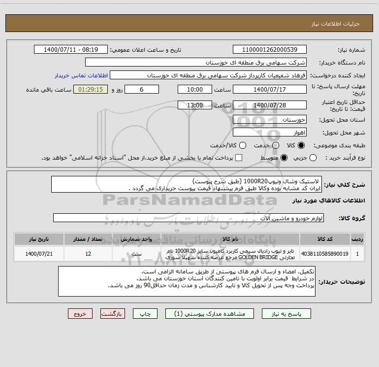 شرح کلی نیاز: لاستیک وشال وتیوپ1000R20 (طبق شرح پیوست) ایران کد مشابه بوده وکالا طبق فرم پیشنهاد قیمت پیوست خریداری می گردد .