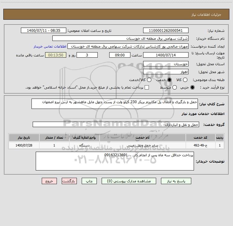 شرح کلی نیاز: حمل و بارگیری و انتقال پل مکانیزم بریکر 230 کیلو ولت از پست چهل مایل ماهشهر به ارس نیرو اصفهان