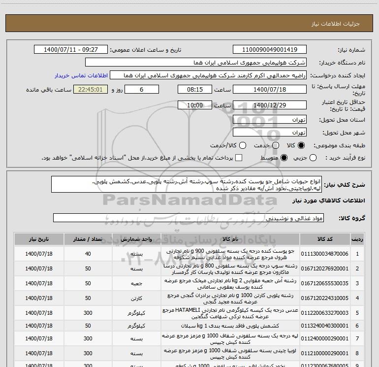 استعلام بها و موضوع استعلام استعلام انواع حبوبات شامل جو پوست کنده.رشته سوپ.رشته آش.رشته پلویی.عدس.کشمش پلویی. لپه.لوبیاچیتی.نخود آش/به مقادیر ذکر شده به اطلاع کلیه شرکتها و افراد متخصص واجد شرایط میرساند، آگهی گذار در نظر دارد از طریق استعلام بها، نسبت به انتخاب و دریافت پیشنهادات اقدام نماید. این استعلام با کد آگهی ثبت شده در سامانه خبرگزاری پارس نماد : 3819105 منتشر شده است. مشخصات استعلام : تاریخ شروع استعلام: 1400/07/11 آخرین مهلت ارسال پیشنهاد قیمت : 1400/07/17 و محل اجرای پروژه : استان تهران میباشد. استعلام قیمت مورد درخواست : استعلام انواع حبوبات شامل جو پوست کنده.رشته سوپ.رشته آش.رشته پلویی.عدس.کشمش پلویی. لپه.لوبیاچیتی.نخود آش/به مقادیر ذکر شده با دستهبندیهای تخصصی و گروه های مرتبط : مواد غذایی, استعلام اطلاع رسانی میگردد.