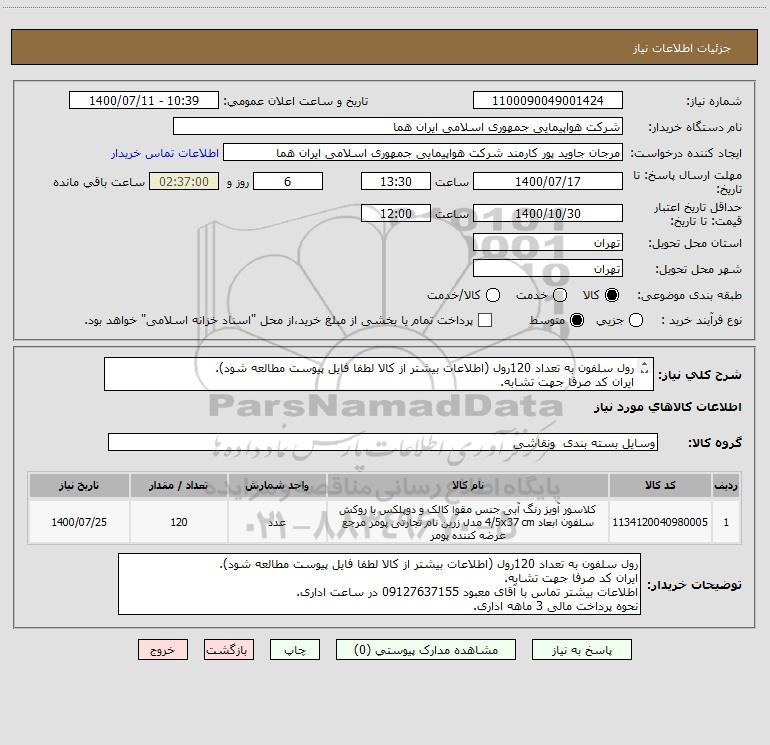 شرح کلی نیاز: رول سلفون به تعداد 120رول (اطلاعات بیشتر از کالا لطفا فایل پیوست مطالعه شود).