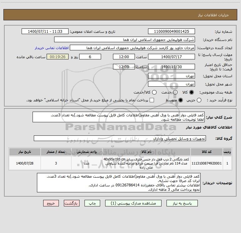 | 1 | 1113100874920001 | کمد بایگانی 2 درب قفل دار جنس فلزی سایز 40x95x195 cm مدل 114 نام تجارتی فرا صنعت مرجع عرضه کننده سیاوش علی زاده | عدد | 3 | 1400/07/28 |