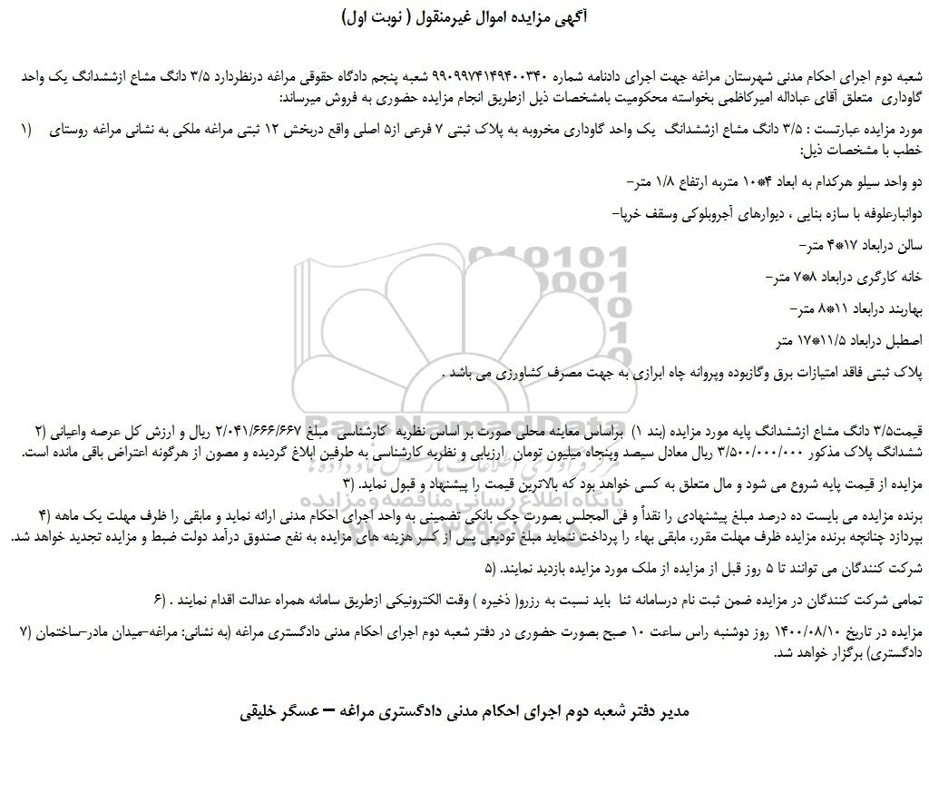 شعبه دوم اجرای احکام مدنی شهرستان مراغه جهت اجرای دادنامه شماره 9909974149400340 شعبه پنجم دادگاه حقوقی مراغه درنظردارد 3/5 دانگ مشاع ازششدانگ یک واحد گاوداری  متعلق آقای عباداله امیرکاظمی بخواسته محکومیت بامشخصات ذیل ازطریق انجام مزایده حضوری به فروش میرساند: