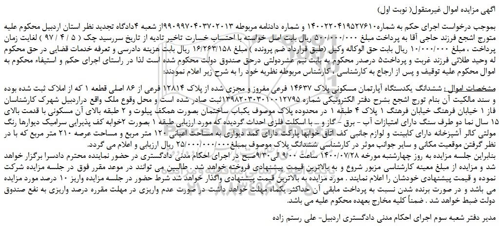 شعبه صادر کننده:شعبه سوم اجرای احکام مدنی دادگستری شهرستان اردبیل
