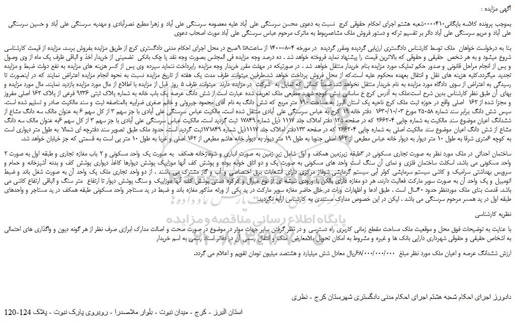 بنا به درخواست خواهان  ملک توسط کارشناس دادگستری ارزیابی گردیده ومقرر گردیده  در مورخه 4-8-1400 از ساعت8تا 9صبح در محل اجرای احکام مدنی دادگستری کرج از طریق مزایده بفروش برسد. مزایده از قیمت کارشناسی شروع میشود و به هر شخص  حقیقی و حقوقی که بالاترین قیمت را پیشنهاد نماید فروخته خواهد شد . ده درصد وجه مزایده فی المجلس بصورت وجه نقد یا چک بانکی  تضمینی از خریدار اخذ و الباقی ظرف یک ماه از وی وصول و پس از انجام مراحل قانونی و صدور حکم تملیک مورد مزایده بنام خریدار منتقل خواهد شد . در صورتیکه در مهلت مقرر خریدار وجه مزایده راپرداخت ننماید سپرده وی پس از کسر هزینه های مزایده به نفع دولت ضبط و مزایده تجدید میگردد.کلیه هزینه های نقل و انتقال بعهده محکوم علیه است.که از محل فروش پرداخت خواهد شد.طرفین میتوانند ظرف مدت یک هفته از تاریخ مزایده نسبت به نحوه انجام مزایده اعتراض نمایند که در اینصورت تا رسیدگی به اعتراض از سوی دادگاه مورد مزایده به نام خریدار منتقل نخواهد شد. ضمناً کسانی که تمایل به  شرکت  در مزایده دارند  میتوانند ظرف 5 روز  قبل از مزایده با اطلاع از مال مورد مزایده بازدید نمایند. مال مورد مزایده و بهای آن طبق نظر کارشناس بدین شرح است:ملک به آدرس کرج خ ساسانی نبش کوچه شهید مطیعی ملک تعریف شده عبارت است از شش دانگ عرصه یک باب خانه به شماره پلاک ثبتی ۹۲۳۶ فرعی از پلاک ۱۶۲ اصلی مفروز و مجزا شده از ۱۶۲  اصلی واقع در حوزه ثبت ملک کرج ناحیه یک استان البرز به مساحت ۱۹۰ متر مربع که شش دانگ به نام آقای محمود جبروتی و خانم صغری ضرابیه بالمناصفه ثبت و سند مالکیت صادر و تسلیم شده است. سپس شش دانگ برابر سند شماره ۲۵۰۵۸ مورخ 1630/10/03  دفتر خانه ۱۹ کرج به عباس سرسنگی علی آبادی منتقل شده است. مالکیت عباس سرسنگی علی آبادی با جز سهم ۳ از کل سهم ۶ به عنوان مالک سه دانگ مشاع از ششدانگ اعیان موضوع سند مالکیت به شماره چاپی ۲۶۶۲۰۴ که در صفحه ۱۲۵ دفتر املاک جلد ۱۱۱۷ ذیل شماره ۱۷۸۴۹ ثبت گردید است. مالکیت عباس سرسنگی علی آبادی با جز سهم ۳ از کل سهم ۶به عنوان مالک سه دانگ مشاع از شش دانگ اعیان موضوع سند مالکیت اصلی به شماره چاپی ۲۶۶۲۰۴ که در صفحه ۱۲۳دفتر املاک جلد ۱۱۱۷ذیل شماره ۱۷۱۸۴۹ثبت گردید است. حدود ملک طبق تصویر سند دفترچه ای شمالا به طول متر دیواری است به کوچه ۶متری شرقا به طول ۱۰ متر دیوار به دیوار خانه عباس مطیعی از ۱۶۲ اصلی جنوبا به طول ۱۹ متر دیوار به دیوار خانه هاشم مطیعی از ۱۶۲ اصلی و غربا به طول ۱۰ متر پی است به قسمتی که جز خیابان خواهد شد.