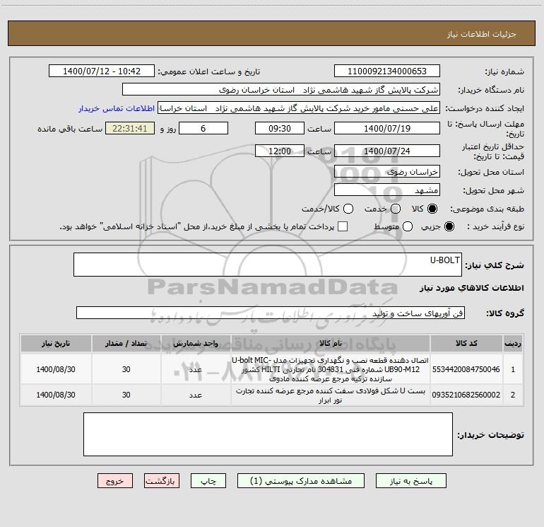 نام دستگاه خریدار:شرکت پالایش گاز شهید هاشمی نژاد استان خراسان رضوی