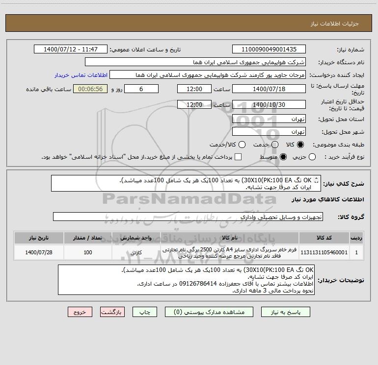 شرح کلی نیاز: OK تگ 30X10(PK:100 EA) به تعداد 100پک هر پک شامل 100عدد میباشد). ایران کد صرفا جهت تشابه. اطلاعات بیشتر توضیحات مطالعه شود.