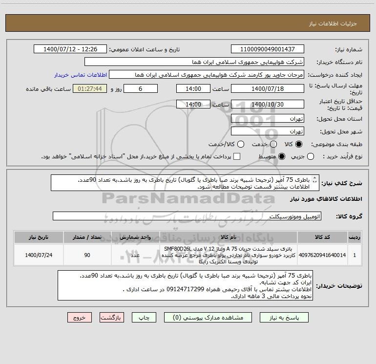 توضیحات خریدار:باطری 75 آمپر (ترجیحا شبیه برند صبا باطری یا گلوبال) تاریخ باطری به روز باشد.به تعداد 90عدد. ایران کد جهت تشابه. اطلاعات بیشتر تماس با آقای رحیمی همراه 09124717299 در ساعت اداری . نحوه پرداخت مالی 3 ماهه اداری.