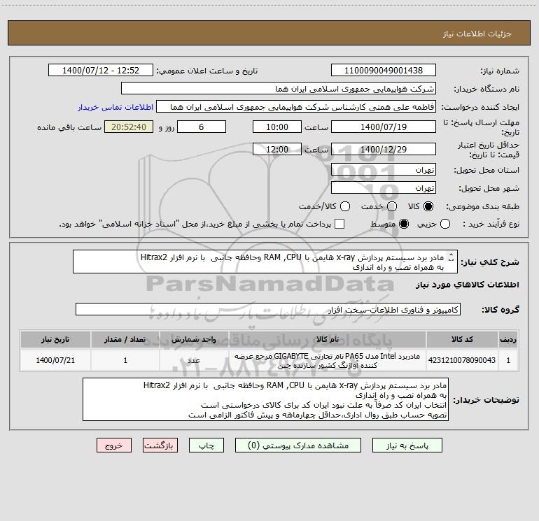 توضیحات خریدار:مادر برد سیستم پردازش x-ray هایمن با RAM ,CPU وحافظه جانبی با نرم افزار Hitrax2 به همراه نصب و راه اندازی انتخاب ایران کد صرفاً به علت نبود ایران کد برای کالای درخواستی است تصویه حساب طبق روال اداری،حداقل چهارماهه و پیش فاکتور الزامی است