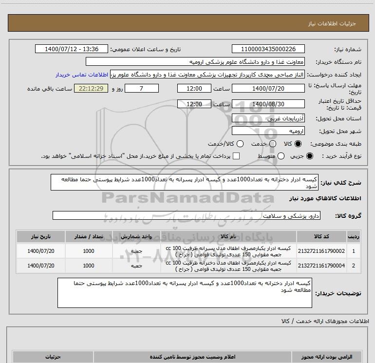 شرح کلی نیاز: کیسه ادرار دخترانه به تعداد1000عدد و کیسه ادرار پسرانه به تعداد1000عدد شرایط پیوستی حتما مطالعه شود