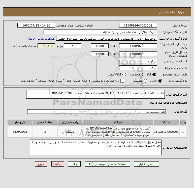 شرح کلی نیاز: نیاز یک قلم شامل 3 عدد MOTOR COMPLETE طبق مشخصات پیوست 33492701-086
