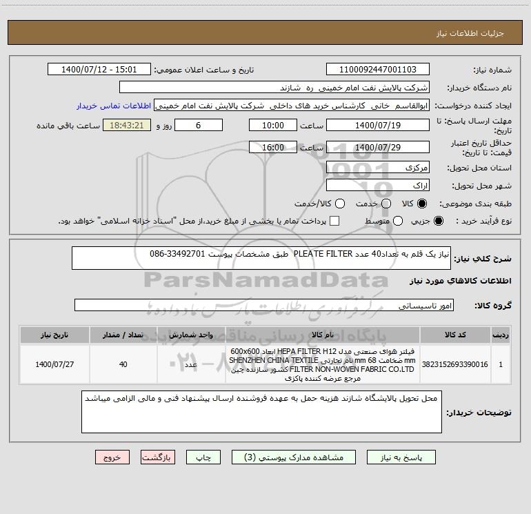 شرح کلی نیاز: نیاز یک قلم به تعداد40 عدد PLEATE FILTER طبق مشخصات پیوست 33492701-086