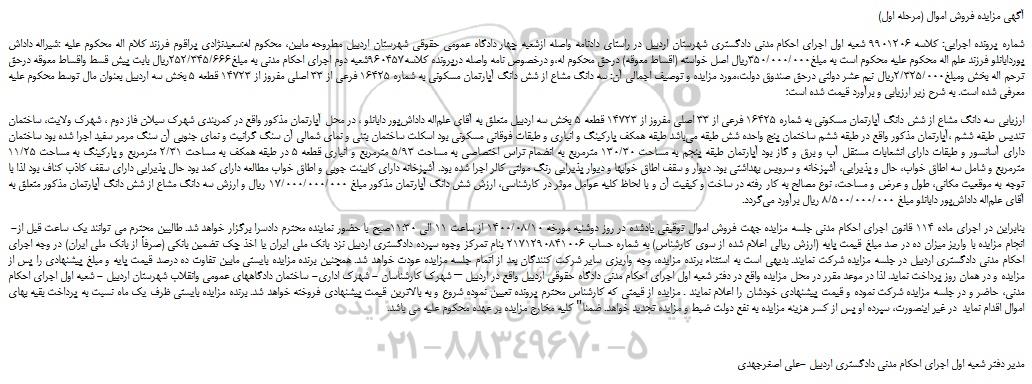 شماره پرونده اجرایی: کلاسه 9901206 شعبه اول اجرای احکام مدنی دادگستری شهرستان اردبیل در راستای دادنامه واصله ازشعبه چهار دادگاه عمومی حقوقی شهرستان اردبیل مطروحه مابین، محکوم له:سعیدنژادی پراقوم فرزند کلام اله محکوم علیه :شیراله داداش پوردابانلو فرزند علم اله محکوم علیه محکوم است به مبلغ350/000/000ریال اصل خواسته (اقساط معوقه) درحق محکوم له،و درخصوص نامه واصله درپرونده کلاسه960457شعبه دوم اجرای احکام مدنی به مبلغ252/345/666ریال بابت پیش قسط واقساط معوقه درحق ترحم اله بخش ومبلغ2/325/000ریال نیم عشر دولتی درحق صندوق دولت،مورد مزایده و توصیف اجمالی آن: سه دانگ مشاع از شش دانگ آپارتمان مسکونی به شماره 16425 فرعی از 33 اصلی مفروز از 14723 قطعه 5 بخش سه اردبیل بعنوان مال توسط محکوم علیه معرفی شده است. به شرح زیر ارزیابی و برآورد قیمت شده است؛