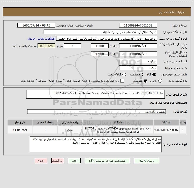 شرح کلی نیاز: نیاز ROTOR SET کامل یک ست طبق مشخصات پیوست می باشد 33492701-086