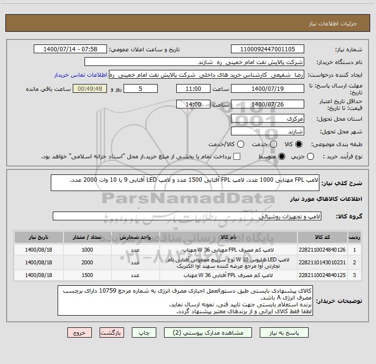 شرح کلی نیاز: لامپ FPL مهتابی 1000 عدد، لامپ FPL آفتابی 1500 عدد و لامپ LED آفتابی 9 یا 10 وات 2000 عدد.