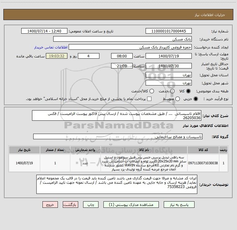 استعلام اقلام تاسیساتی ... / طبق مشخصات پیوست شده / ارسال پیش فاکتور پیوست الزامیست / فکس 26205036, استعلام اقلام تاسیساتی ... / طبق مشخصات پیوست شده / ارسال پیش فاکتور پیوست الزامیست / فکس 26205036