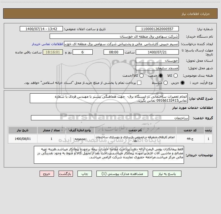 شرح کلی نیاز: انجام تعمیرات ساختمانی در ایستگاه برق- جهت هماهنگی بیشتر با مهندس فردی با شماره تماس09166132415 تماس بگیرید.