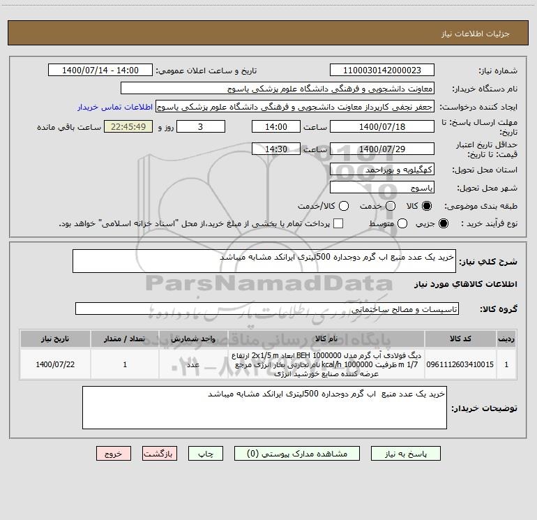 شرح کلی نیاز: خرید یک عدد منبع اب گرم دوجداره 500لیتری ایرانکد مشابه میباشد