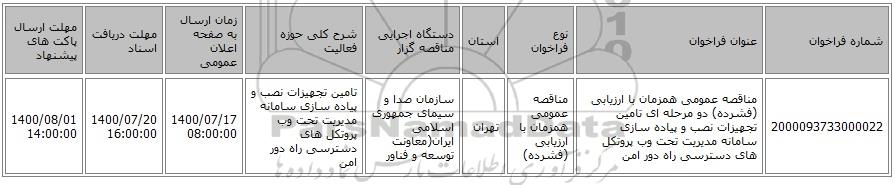 | 2000093733000022 | مناقصه عمومی همزمان با ارزیابی (فشرده) دو مرحله ای تامین تجهیزات نصب و پیاده سازی سامانه مدیریت تحت وب پروتکل های دسترسی راه دور امن | مناقصه عمومی همزمان با ارزیابی (فشرده) | تهران | سازمان صدا و سیمای جمهوری اسلامی ایران(معاونت توسعه و فناور | تامین تجهیزات نصب و پیاده سازی سامانه مدیریت تحت وب پروتکل های دسترسی راه دور امن | 1400/07/17 08:00:00 | 1400/07/20 16:00:00 | 1400/08/01 14:00:00 |