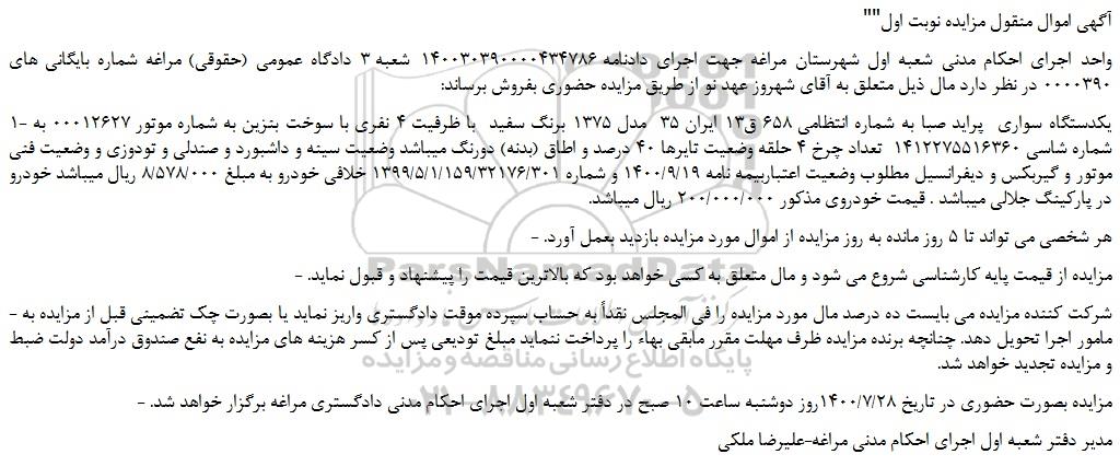 1- یکدستگاه سواری پراید صبا به شماره انتظامی 658 ق13 ایران 35 مدل 1375 برنگ سفید با ظرفیت 4 نفری با سوخت بنزین به شماره موتور 00012627 به شماره شاسی 1412275516360 تعداد چرخ 4 حلقه وضعیت تایرها 40 درصد و اطاق (بدنه) دورنگ میباشد وضعیت سینه و داشبورد و صندلی و تودوزی و وضعیت فنی موتور و گیربکس و دیفرانسیل مطلوب وضعیت اعتباربیمه نامه 1400/9/19 و شماره 1399/5/1/159/32176/301 خلافی خودرو به مبلغ 8/578/000 ریال میباشد خودرو در پارکینگ جلالی میباشد . قیمت خودروی مذکور 200/000/000 ریال میباشد.