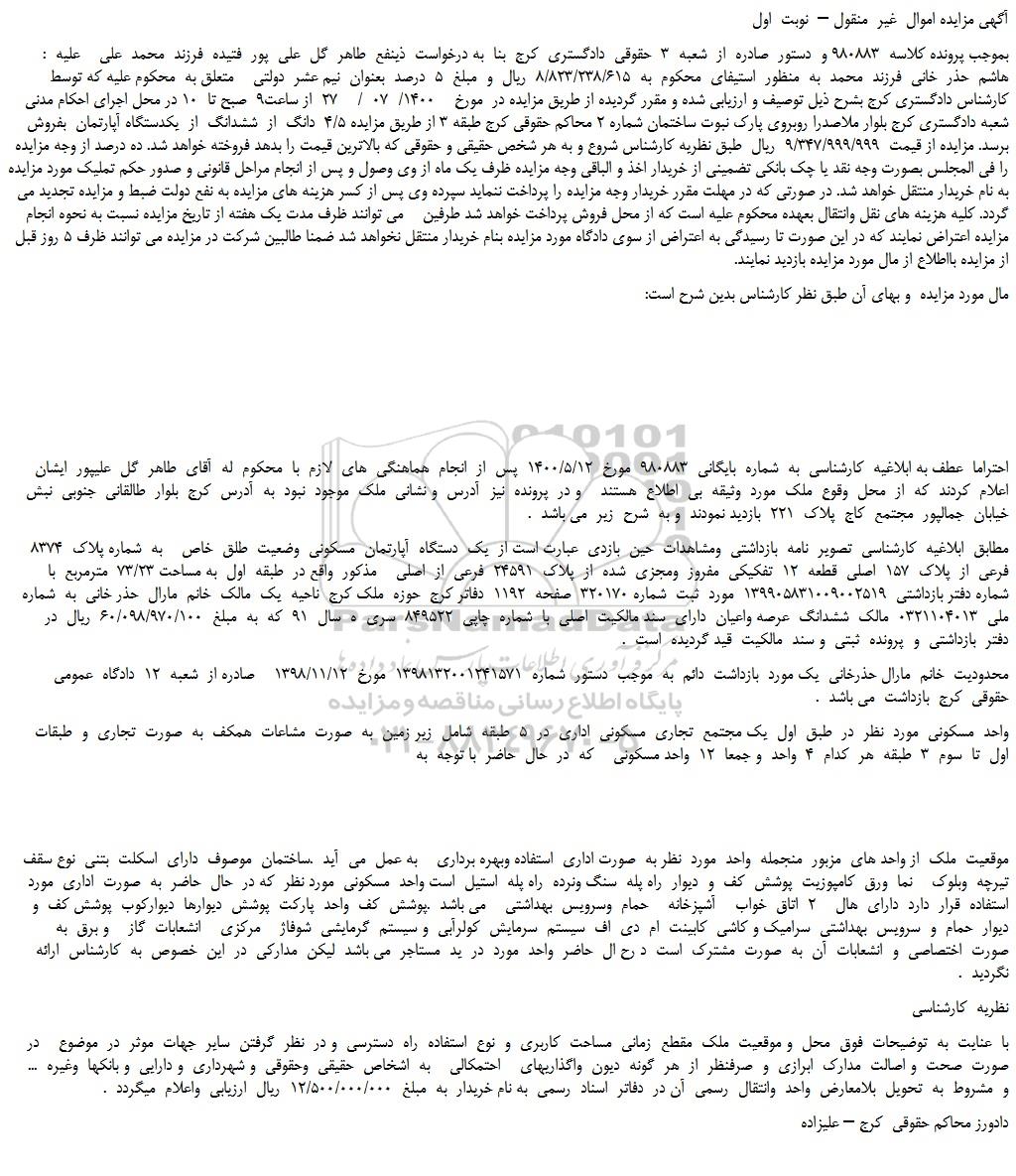 بموجب پرونده کلاسه 980883 و دستور صادره از شعبه 3 حقوقی دادگستری کرج بنا به درخواست ذینفع طاهر گل علی پور فتیده فرزند محمد علی علیه : هاشم حذر خانی فرزند محمد به منظور استیفای محکوم به 8/823/238/615 ریال و مبلغ 5 درصد بعنوان نیم عشر دولتی متعلق به محکوم علیه که توسط کارشناس دادگستری کرج بشرح ذیل توصیف و ارزیابی شده و مقرر گردیده از طریق مزایده در مورخ 1400/ 07 / 27 از ساعت9 صبح تا 10 در محل اجرای احکام مدنی شعبه دادگستری کرج بلوار ملاصدرا روبروی پارک نبوت ساختمان شماره 2 محاکم حقوقی کرج طبقه 3 از طریق مزایده 4/5 دانگ از ششدانگ از یکدستگاه آپارتمان بفروش برسد. مزایده از قیمت 9/347/999/999 ریال طبق نظریه کارشناس شروع و به هر شخص حقیقی و حقوقی که بالاترین قیمت را بدهد فروخته خواهد شد. ده درصد از وجه مزایده را فی المجلس بصورت وجه نقد یا چک بانکی تضمینی از خریدار اخذ و الباقی وجه مزایده ظرف یک ماه از وی وصول و پس از انجام مراحل قانونی و صدور حکم تملیک مورد مزایده به نام خریدار منتقل خواهد شد. در صورتی که در مهلت مقرر خریدار وجه مزایده را پرداخت ننماید سپرده وی پس از کسر هزینه های مزایده به نفع دولت ضبط و مزایده تجدید می گردد. کلیه هزینه های نقل وانتقال بعهده محکوم علیه است که از محل فروش پرداخت خواهد شد طرفین می توانند ظرف مدت یک هفته از تاریخ مزایده نسبت به نحوه انجام مزایده اعتراض نمایند که در این صورت تا رسیدگی به اعتراض از سوی دادگاه مورد مزایده بنام خریدار منتقل نخواهد شد ضمنا طالبین شرکت در مزایده می توانند ظرف 5 روز قبل از مزایده بااطلاع از مال مورد مزایده بازدید نمایند.