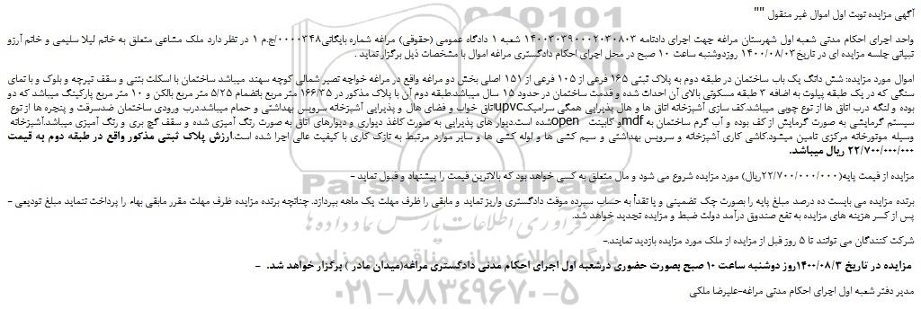 - مزایده در تاریخ 1400/08/3روز دوشنبه ساعت 10 صبح بصورت حضوری درشعبه اول اجرای احکام مدنی دادگستری مراغه(میدان مادر ) برگزار خواهد شد.