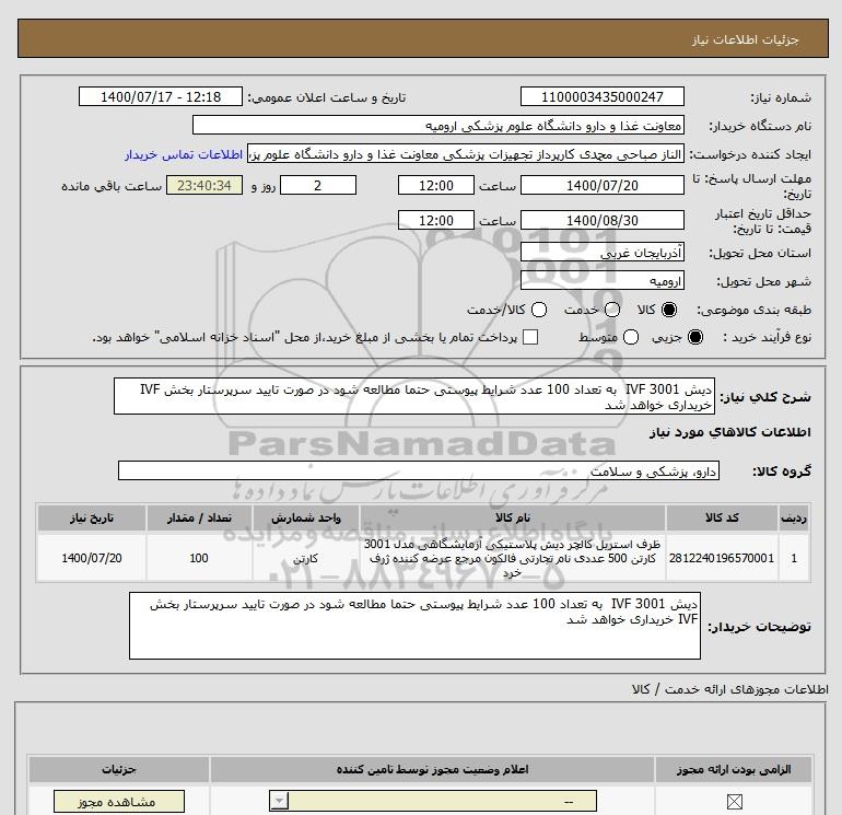 شرح کلی نیاز: دیش 3001 IVF به تعداد 100 عدد شرایط پیوستی حتما مطالعه شود در صورت تایید سرپرستار بخش IVF خریداری خواهد شد