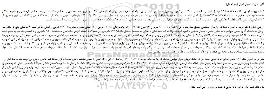 شماره پرونده اجرایی: کلاسه 9902030 شعبه اول اجرای احکام مدنی دادگستری شهرستان اردبیل در راستای اجرای نیابت واصله ازشعبه سوم اجرای احکام مدنی دادگستری تبریز مطروحه مابین، محکوم له:غفارحسن زاده محکوم علیه:حسین جوانمردفرزندگل محمدمحکوم علیه محکوم هستند به مبلغ21/573/998/167ریال اصل خواسته درحق محکوم له ومبلغ5 درصد نیم عشردولتی،مورد مزایده و توصیف اجمالی آن: شش دانگ یکدستگاه آپارتمان مسکونی به پلاک ثبتی 34382 فرعی از 33 اصلی مفروز و مجزی از 1712 فرعی از اصلی مذکور قطعه 6 تفکیکی واقع در بخش سه اردبیل به مالکیت آقای حسین جوانمرد و به نشانی اردبیل ، خیابان عطایی ، کوچه فرهنگ ،پلاک 89 طبقه شش به شرح زیر ارزیابی و برآورد قیمت شده است؛