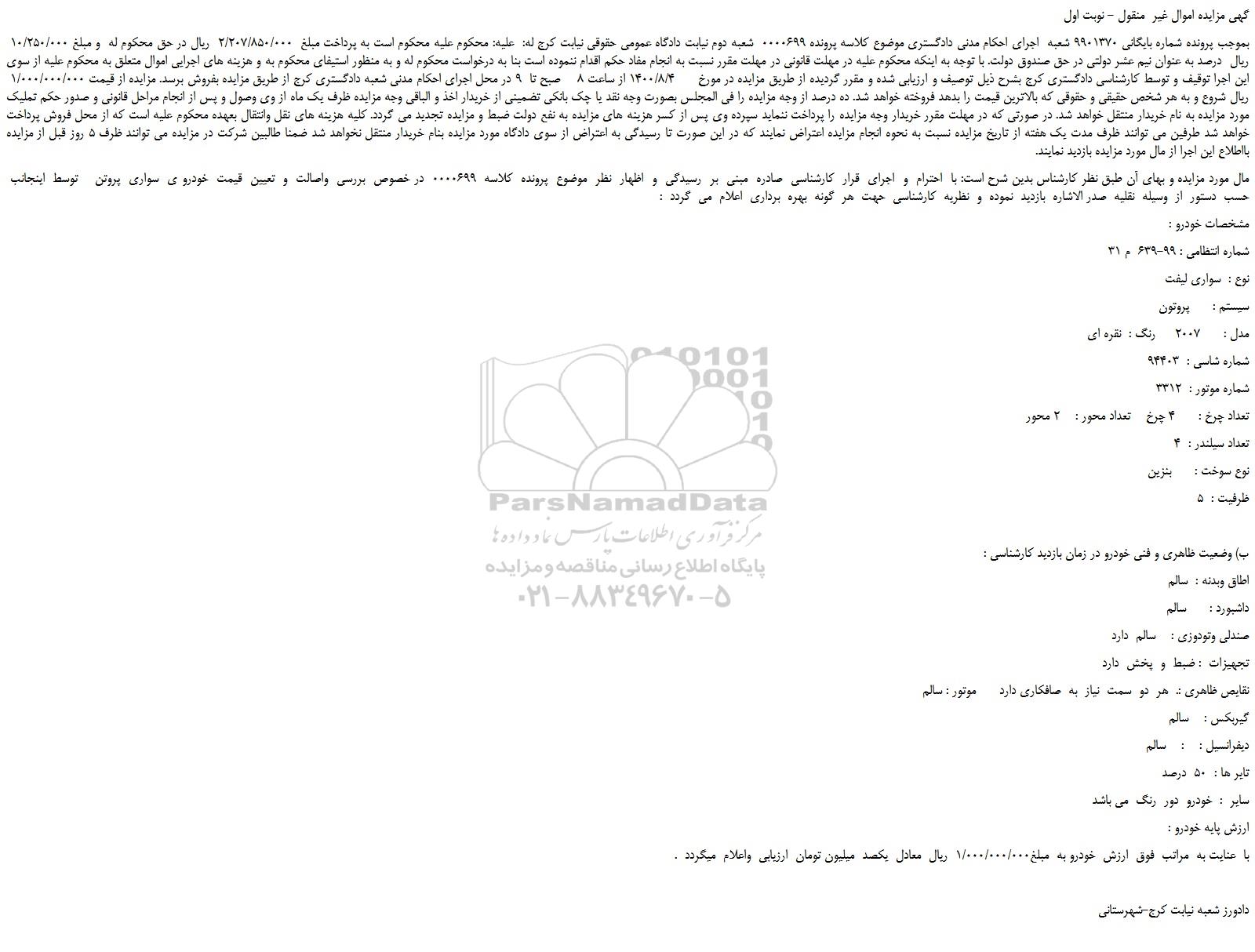 مال مورد مزایده و بهای آن طبق نظر کارشناس بدین شرح است: با  احترام  و  اجرای  قرار  کارشناسی  صادره  مبنی  بر  رسیدگی  و  اظهار  نظر  موضوع  پرونده  کلاسه  0000699  در خصوص  بررسی  واصالت  و  تعیین  قیمت  خودرو ی  سواری  پروتن    توسط  اینجانب  حسب  دستور  از  وسیله  نقلیه  صدر الاشاره  بازدید  نموده  و  نظریه  کارشناسی  حهت  هر  گونه  بهره  برداری  اعلام  می  گردد  :