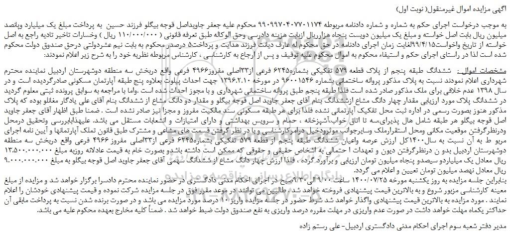 به موجب درخواست اجرای حکم به شماره و شماره دادنامه مربوطه 9909970407701174 محکوم علیه جعفر جاویداصل قوجه بیگلو فرزند حسین  به پرداخت مبلغ یک میلیارد وپانصد میلیون ریال بابت اصل خواسته و مبلغ یک میلیون دویست پنجاه هزارریال ازبابت هزینه دادرسی وحق الوکاله طبق تعرفه قانونی ( 110/000/000 ریال ) وخسارات تاخیر تادیه راجع به اصل خواسته از تاریخ واخواست99/4/15لغایت زمان اجرای دادنامه در حق محکوم له عارف دیانت فرزند هدایت و پرداخت5 درصدر محکوم به بابت نیم عشردولتی درحق صندوق دولت محکوم شده است لذا در راستای اجرای حکم و استیفاء محکوم به اموال محکوم علیه توقیف و پس از ارجاع به کارشناسی ، کارشناس مربوطه نظریه خود را به شرح زیر اعلام نمودند: