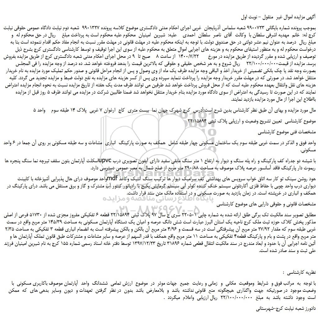 بموجب پرونده شماره بایگانی 9900723 شعبه سلماس آذربایجان  غربی اجرای احکام مدنی دادگستری موضوع کلاسه پرونده 9901327  شعبه دوم نیابت دادگاه عمومی حقوقی نیابت کرج له:  خانم  مهدیه اشرفی سلطان با  وکالت  آقای  ناصر  سلطان  احمدی    علیه:  شیرین  امینیان  محکوم علیه محکوم است به پرداخت مبلغ    ریال در حق محکوم له  و مبلغ ریال  درصد به عنوان نیم عشر دولتی در حق صندوق دولت. با توجه به اینکه محکوم علیه در مهلت قانونی در مهلت مقرر نسبت به انجام مفاد حکم اقدام ننموده است بنا به درخواست محکوم له و به منظور استیفای محکوم به و هزینه های اجرایی اموال متعلق به محکوم علیه از سوی این اجرا توقیف و توسط کارشناسی دادگستری کرج بشرح ذیل توصیف و ارزیابی شده و مقرر گردیده از طریق مزایده در مورخ      1400/7/22  از ساعت 8    صبح تا  9 در محل اجرای احکام مدنی شعبه دادگستری کرج از طریق مزایده بفروش برسد. مزایده از قیمت22/100/000/000    ریال شروع و به هر شخص حقیقی و حقوقی که بالاترین قیمت را بدهد فروخته خواهد شد. ده درصد از وجه مزایده را فی المجلس بصورت وجه نقد یا چک بانکی تضمینی از خریدار اخذ و الباقی وجه مزایده ظرف یک ماه از وی وصول و پس از انجام مراحل قانونی و صدور حکم تملیک مورد مزایده به نام خریدار منتقل خواهد شد. در صورتی که در مهلت مقرر خریدار وجه مزایده را پرداخت ننماید سپرده وی پس از کسر هزینه های مزایده به نفع دولت ضبط و مزایده تجدید می گردد. کلیه هزینه های نقل وانتقال بعهده محکوم علیه است که از محل فروش پرداخت خواهد شد طرفین می توانند ظرف مدت یک هفته از تاریخ مزایده نسبت به نحوه انجام مزایده اعتراض نمایند که در این صورت تا رسیدگی به اعتراض از سوی دادگاه مورد مزایده بنام خریدار منتقل نخواهد شد ضمنا طالبین شرکت در مزایده می توانند ظرف 5 روز قبل از مزایده بااطلاع این اجرا از مال مورد مزایده بازدید نمایند.
