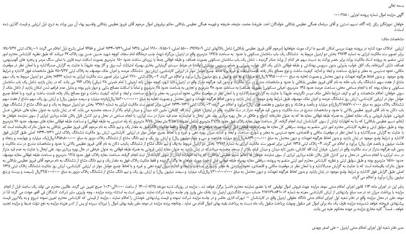 آگهی مزایده اموال شماره پرونده اجرایی : 0000388