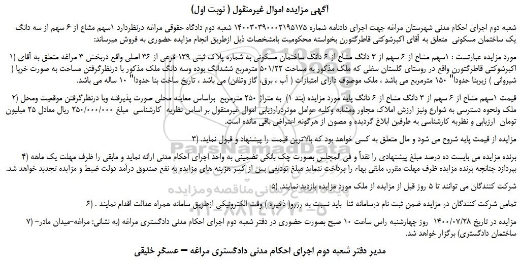 شعبه دوم اجرای احکام مدنی شهرستان مراغه جهت اجرای دادنامه شماره 140030390002195175 شعبه دوم دادگاه حقوقی مراغه درنظردارد 1سهم مشاع از 6 سهم از سه دانگ یک ساختمان مسکونی متعلق به آقای اکبرشوکتی قاطرگتورن بخواسته محکومیت بامشخصات ذیل ازطریق انجام مزایده حضوری به فروش میرساند: