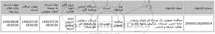 | 2000001262000014 | مناقصه عمومی یک مرحله ای انجام خدمات جابه جایی، چیدمان، بارگیری، تخلیه کالا و نظافت انبارها و اجناس | مناقصه عمومی | خوزستان | شرکت سهامی برق منطقه ای خوزستان | انجام خدمات عمومی انبارها | 1400/07/18 08:00:00 | 1400/07/25 18:00:00 | 1400/08/08 18:00:00 |