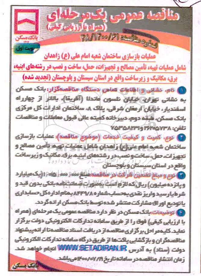 عملیات بازسازی ساختمان شعبه امام علی (ع) زاهدان شامل عملیات تهیه ، تامین مصالح و تجهیزات ، حمل ، ساخت و نصب در رشته های ابنیه ، برق ، مکانیک و زیرساخت واقع در استان سیستان و بلوچستان (تجدید شده)