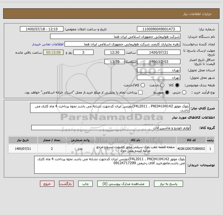 شرح کلی نیاز: بلوک موتور F4L2011 . PN(04104142)دویتس ایران کدجهت تشابه می باشد نحوه پرداخت 4 ماه کاری می باشد.