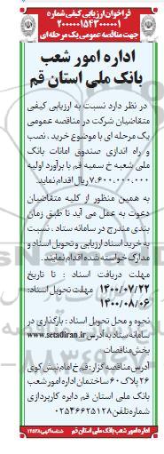 اداره امور شعب بانک ملی استان قم در نظر دارد نسبت به ارزیابی کیفی متقاضیان شرکت در مناقصه عمومی یک مرحله ای با موضوع خرید، نصب و ره اندازی صندوق امانات بانک ملی شعب خ سمیه قم با برآورد اولیه 7.600.000.000 ریال اقدام نماید
