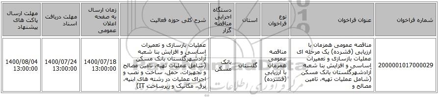 2000001017000029 | مناقصه عمومی همزمان با ارزیابی (فشرده) یک مرحله ای عملیات بازسازی و تعمیرات اساسی و افزایش بنا شعبه آزادشهرگلستان بانک مسکن (شامل عملیات تهیه، تامین مصالح و | مناقصه عمومی همزمان با ارزیابی (فشرده) | گلستان | بانک مسکن | عملیات بازسازی و تعمیرات اساسی و افزایش بنا شعبه آزادشهرگلستان بانک مسکن (شامل عملیات تهیه، تامین مصالح و تجهیزات، حمل، ساخت و نصب و اجرای عملیات در رشته های ابنیه، برق، مکانیک و زیرساخت IT) | 1400/07/18 13:00:00 | 1400/07/24 13:00:00 | 1400/08/04 13:00:00 |