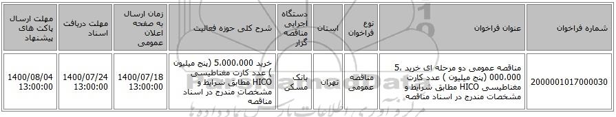 2000001017000030 | مناقصه عمومی دو مرحله ای خرید 5،000،000 (پنج میلیون ) عدد کارت مغناطیسی HICO مطابق شرایط و مشخصات مندرج در اسناد مناقصه | مناقصه عمومی | تهران | بانک مسکن | خرید 5،000،000 (پنج میلیون ) عدد کارت مغناطیسی HICO مطابق شرایط و مشخصات مندرج در اسناد مناقصه | 1400/07/18 13:00:00 | 1400/07/24 13:00:00 | 1400/08/04 13:00:00 |